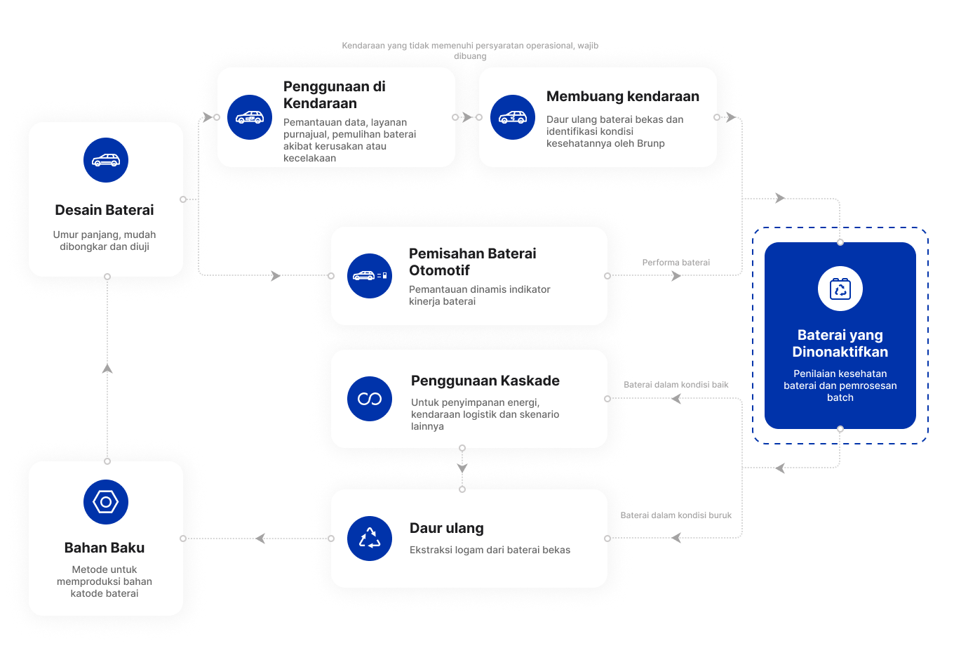 Dengan dukungan anak perusahaannya, Brunp, CATL bekerja sama dengan pelanggan untuk membuat sirkulasi tertutup dalam "produksi – penerapan – penggunaan eselon – daur ulang baterai". Di saat yang sama, CATL sedang melakukan negosiasi dengan mitra lokal di Eropa untuk kerja sama strategis di bidang bahan katode aktif dan daur ulang baterai, guna mempromosikan pelokalan CATL di Eropa dan mengembangkan rantai nilai baterai yang berkelanjutan, sehingga CATL dapat berkontribusi untuk mencapai tujuan netralitas karbon global.