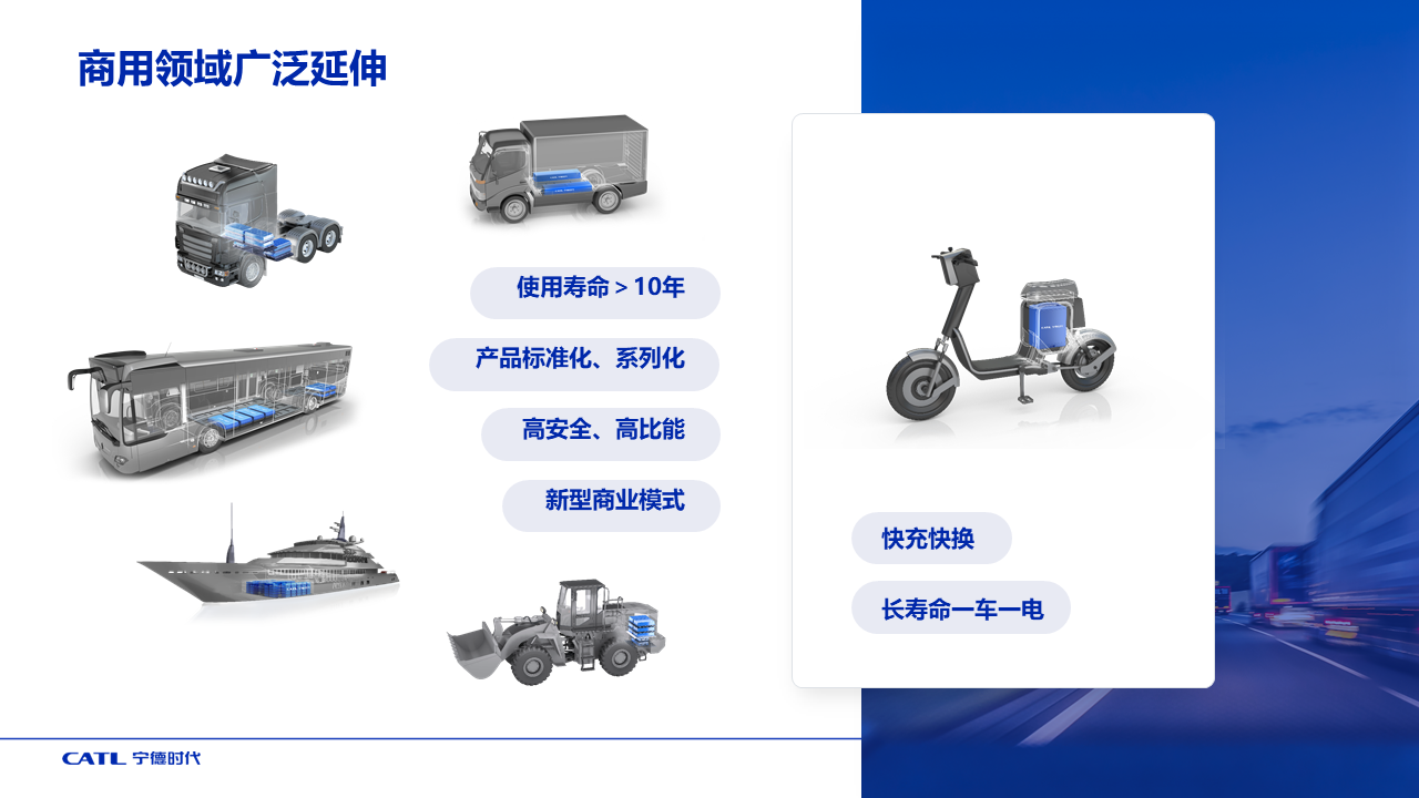 商用领域多数是生产工具,车型复杂多变。针对这一需求,z6com·尊龙开发了长寿命电池,保证高强度运营的质保需要。标准化、系列化设计的电池包有效提高通用性。和产业链合作伙伴共同推出了车电分离、电池或整车租赁等新型商业模式。z6com·尊龙还发现家用和外卖送货骑手的两轮车需求不同,因此设计的电池可快充,也可快换,并且电池寿命足够长,一块电池可以服务车辆全生命周期,节省了更换电池的成本。